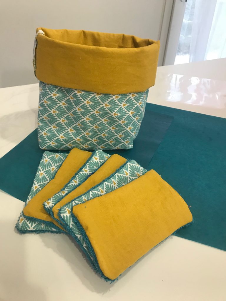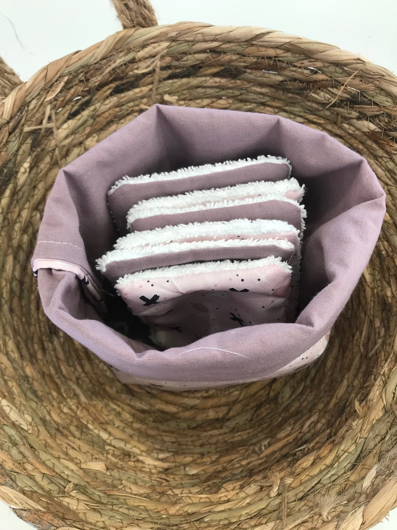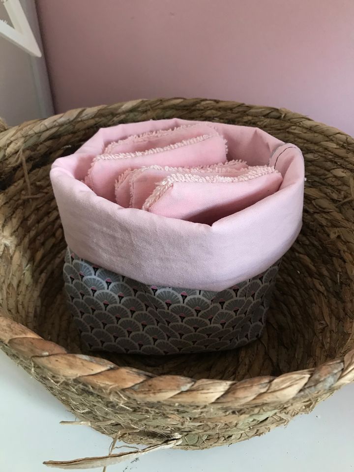 Pour prendre soin de soi avec douceur, voici un ensemble composé d’une jolie corbeille en coton doublé ainsi qu’un lot de six lingettes (coton et éponge)