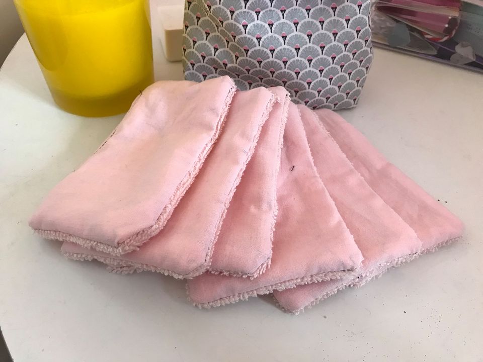 Lot de six lingettes en éponge de couleur rose poudré avec un tissus en coton rose poudré unis .