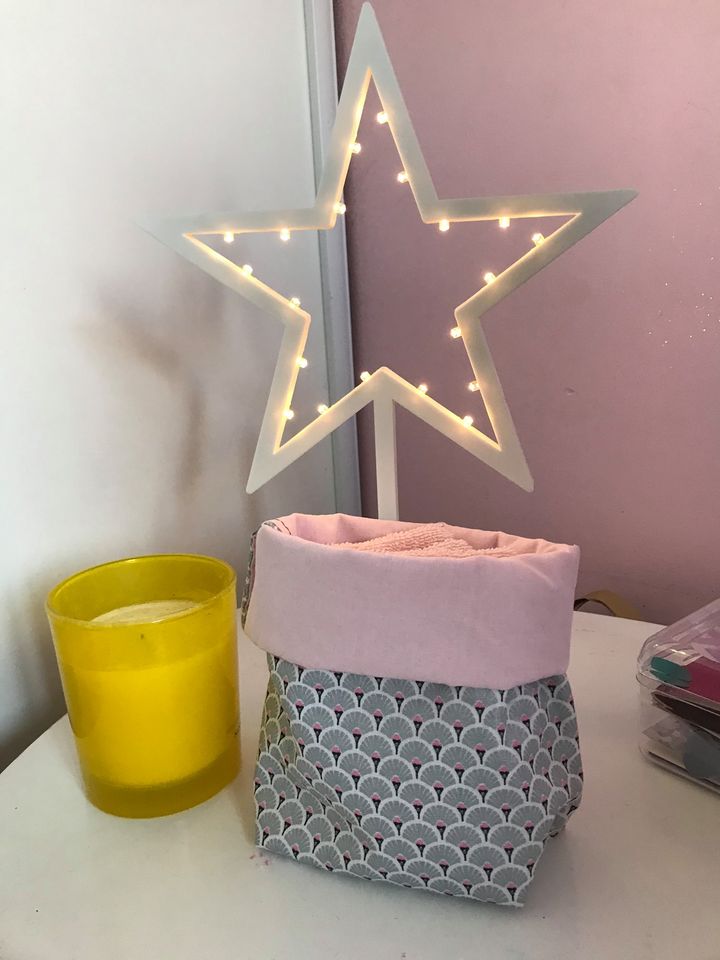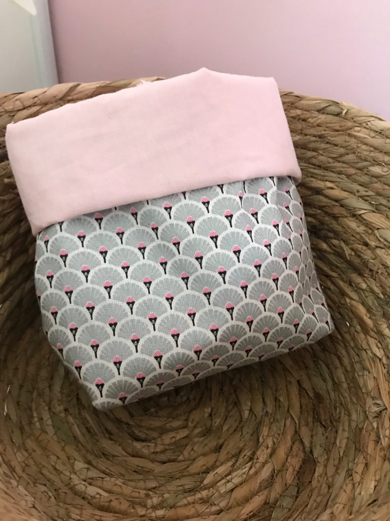Corbeille en coton aux motifs d’éventails gris, rose poudré et blanc, doublée d’un tissus de coton rose poudré unis.