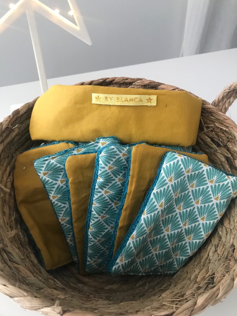 Lot de trois lingettes en éponge de couleur bleu pétrole avec un tissus en coton bleu pétrole composé de motif moutarde et blanc, complété par trois lingettes en éponge bleu pétrole avec son coton de couleur moutarde unis .