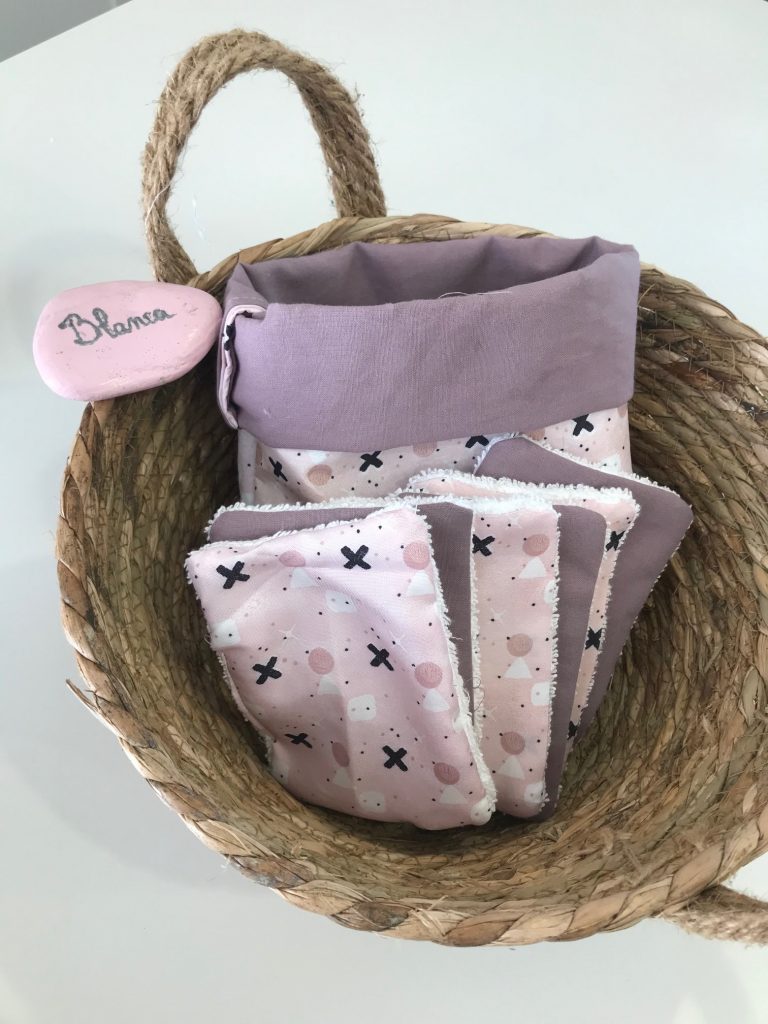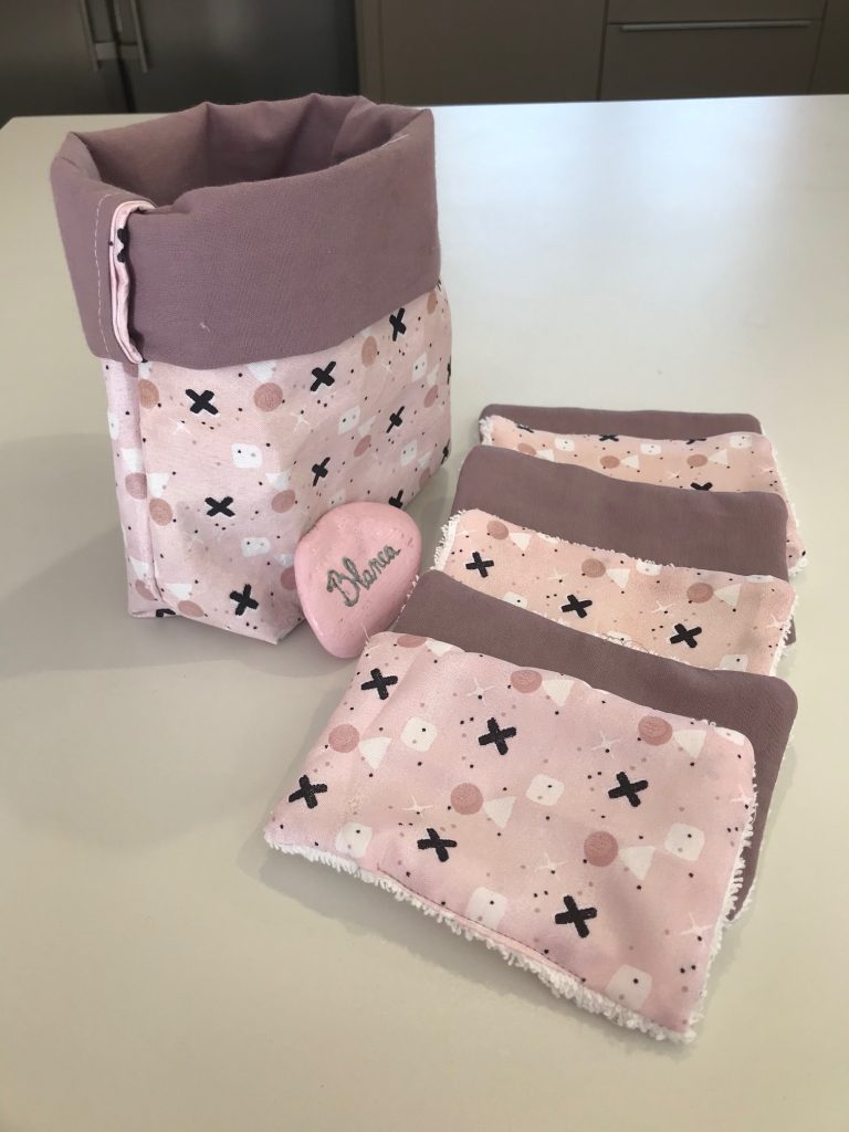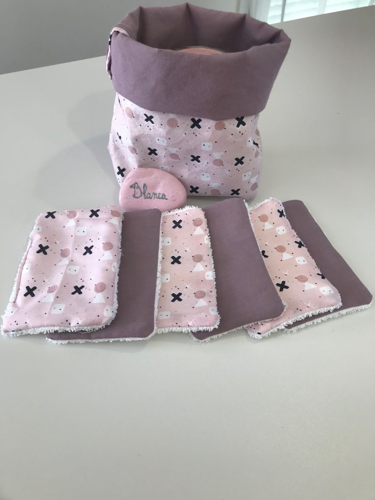 Lot de trois lingettes en éponge blanche et un tissus en coton rose poudré avec des motifs en forme de croix de couleur noire, blanche et violet clair , complété par trois lingettes en éponge blanche avec son tissus en coton unis violet .