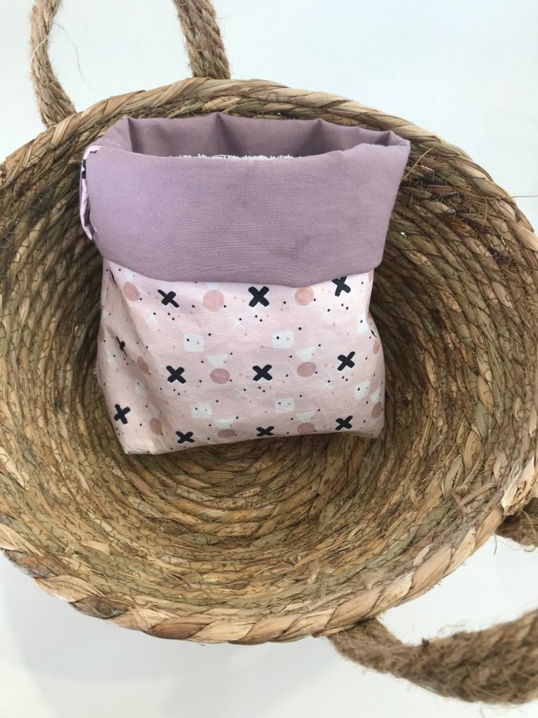 Corbeille en coton rose poudré avec des motifs en forme de croix de couleur noire, blanche et violet clair.